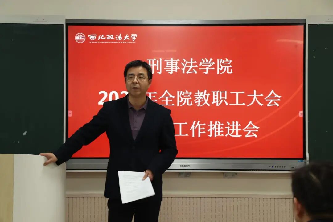 3月18日下午,刑事法学院召开2026年全院教职工大会暨教学工作推进会。教务处老师莅临指导,学院领导班子及全体教职工参加会议,会议由党委书记孙学龙主持。